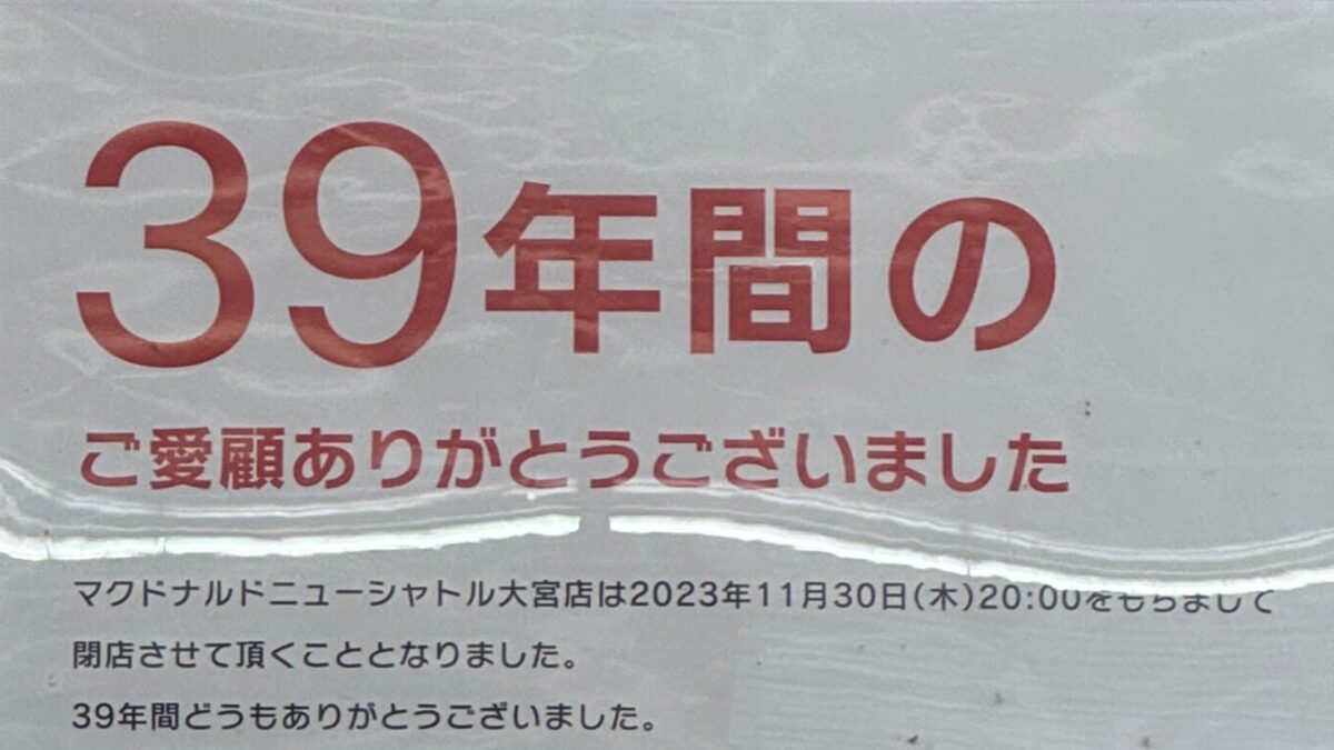そう、ニューシャトル大宮駅改札前にずっと存在した、あの開放感ある「マクドナルド ニューシャトル大宮店」が、39年間の歴史に幕を下ろすこととなりました。11月30日(木)20時に、完全な閉店です。