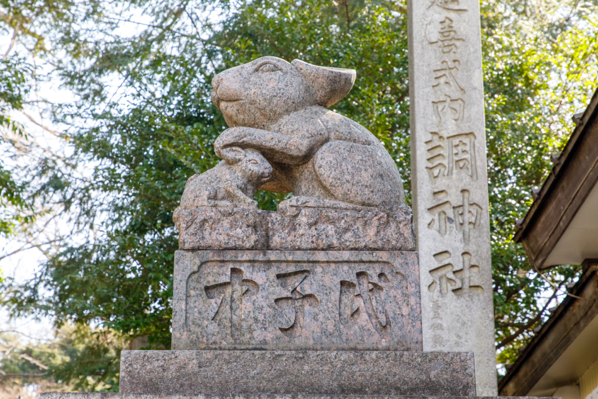 調神社といえば「調(つき)」の読みから「月信仰」に結びつき、そこから月神の使いとして狛犬の代わりに卯(兎)の石像が設置されています。