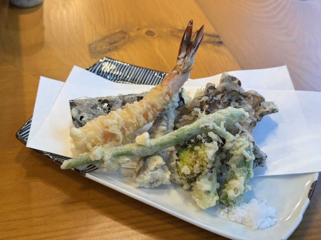 天ぷらもボリュームある盛り合わせで、お得感ありますね。天つゆも別添えスタイルなので、単品で楽しむことも可能です。