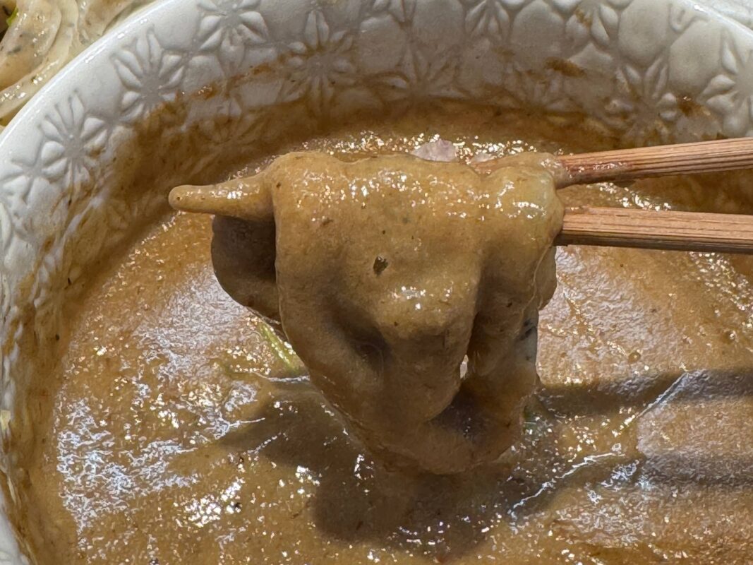 つけ汁が・・・そのままついてくる。感覚としてはチーズフォンデュの具材をチーズにディップしているような感じ。この粘度は知りうる限りで最高レベルかも。