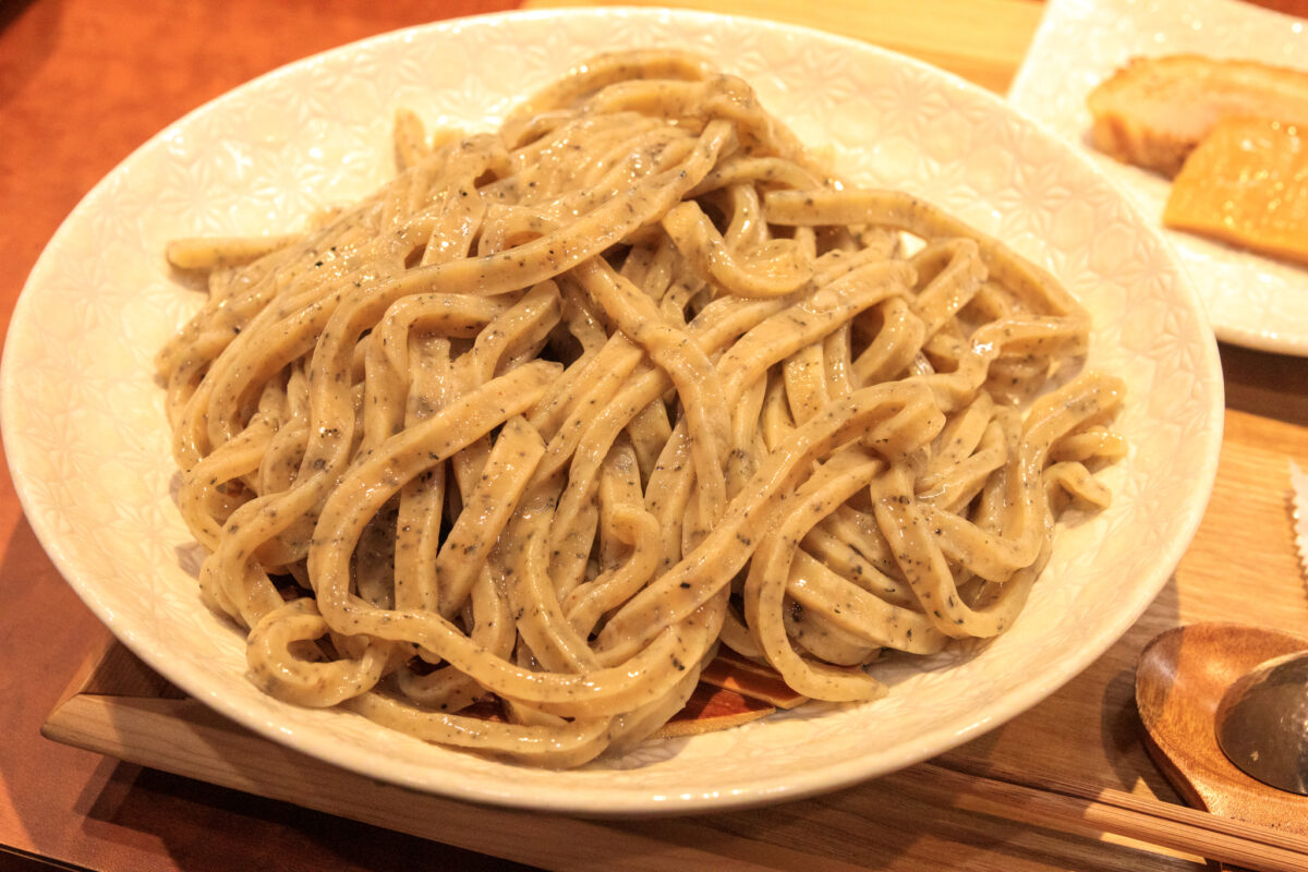 まず、麺が圧倒的。ごまが練り込まれ、その名の通り「御影石(みかげいし)」のようなビジュアルの麺は、武蔵野うどんのような歯ごたえと、芳醇な小麦の香り、そしてごまの爽やかな香りと味わいがサッとかけぬけるという、これだけで商品成り立ってしまうほどの恐ろしい完成度。提供時に「青のりと藻塩をかけて麺だけで食べてみてください」と案内を受けますが、これがあまりにもおいしすぎて、つけ汁になかなか進めません。麺単品だけでどんどん食べられてしまうラーメンって、なかなかにレアです。